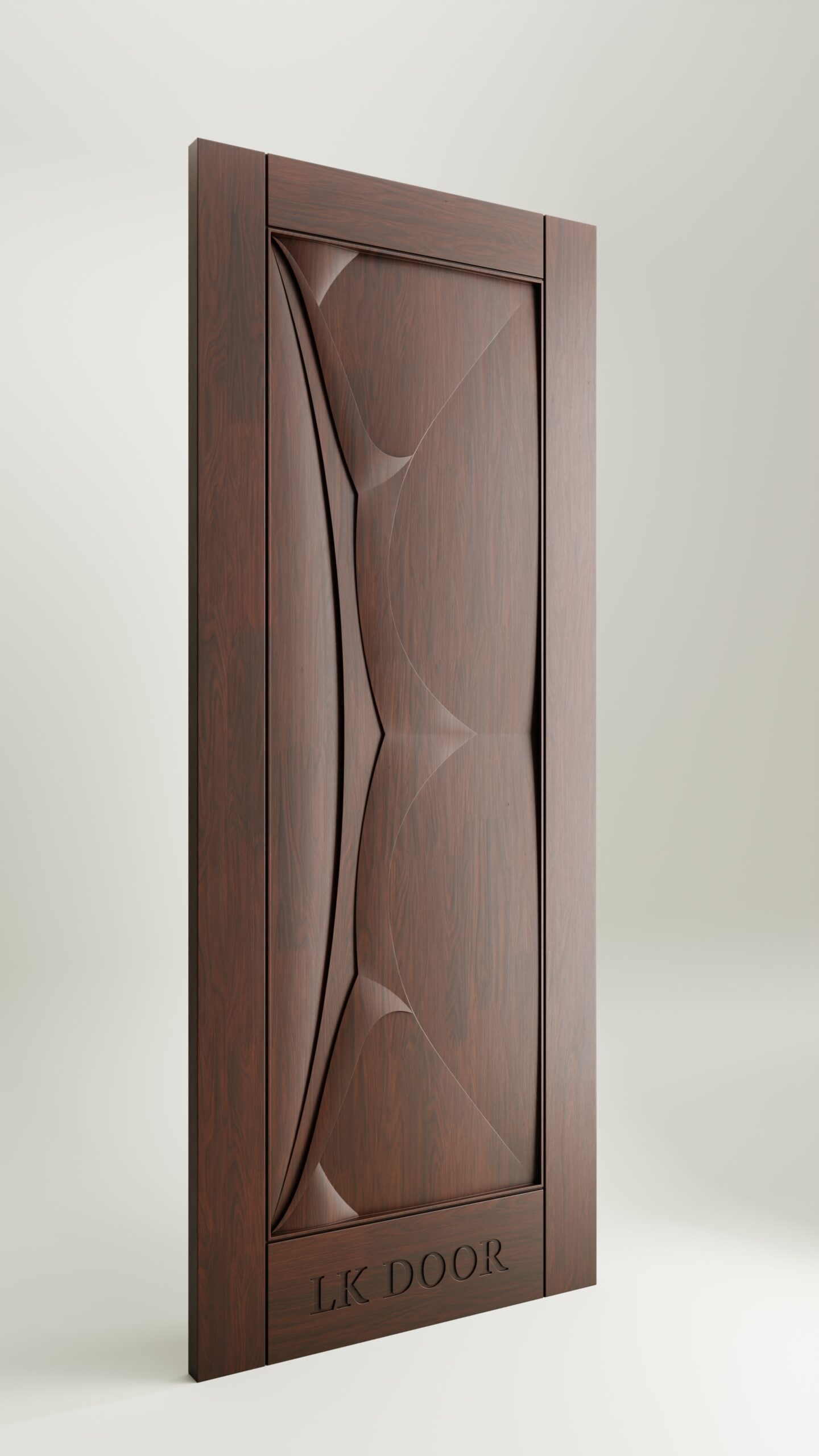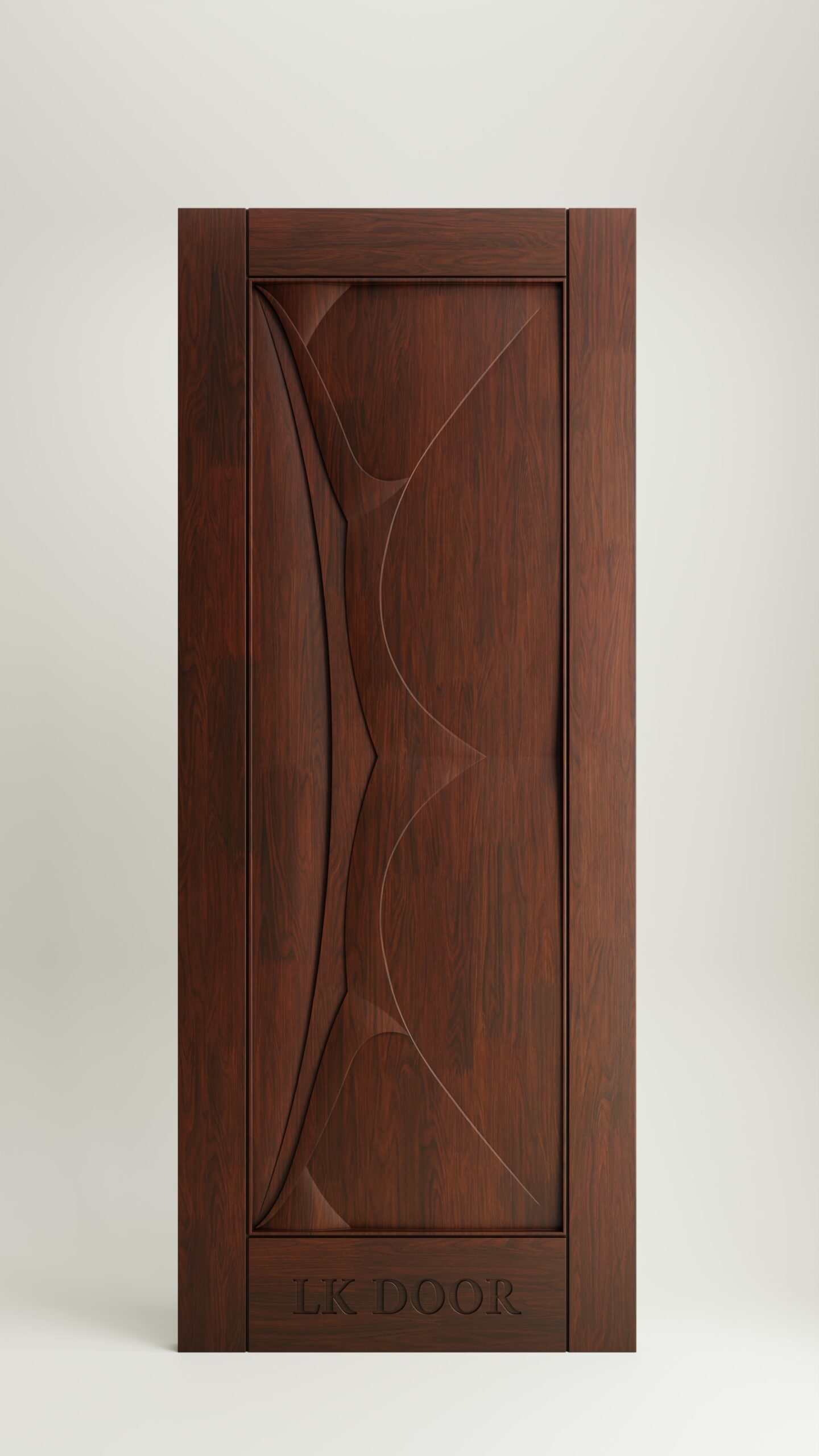 A striking solid wood door with a unique abstract design, creating a sense of movement and intrigue.